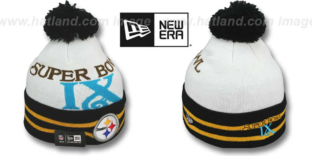 NOW $19.99white acrylic knit beanie with ribbed cuff, raised embroidered team logo on front of cuff with team color striping, large printed official Super Bowl IX logo on crown, embroidered New Era Flag on side, matching emboidered Super Bowl logo on back, matching team color pom-pom. This item is on SALE!