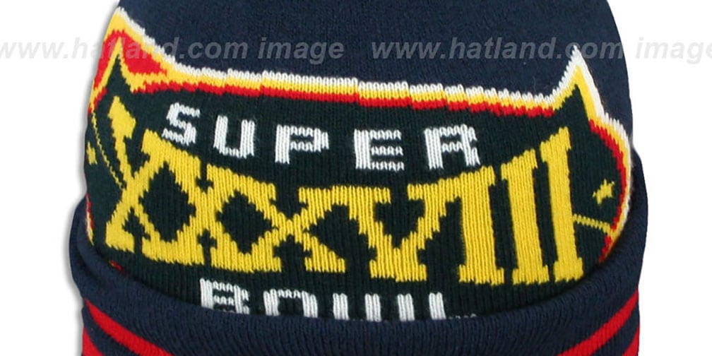 NOW $14.99navy blue acrylic knit beanie with ribbed cuff, raised embroidered team logo on front of cuff with team color striping, large printed official Super Bowl XXXVIII logo on crown, embroidered New Era Flag on side, matching emboidered Super Bowl logo on back, matching team color pom-pom. This item is on SALE!