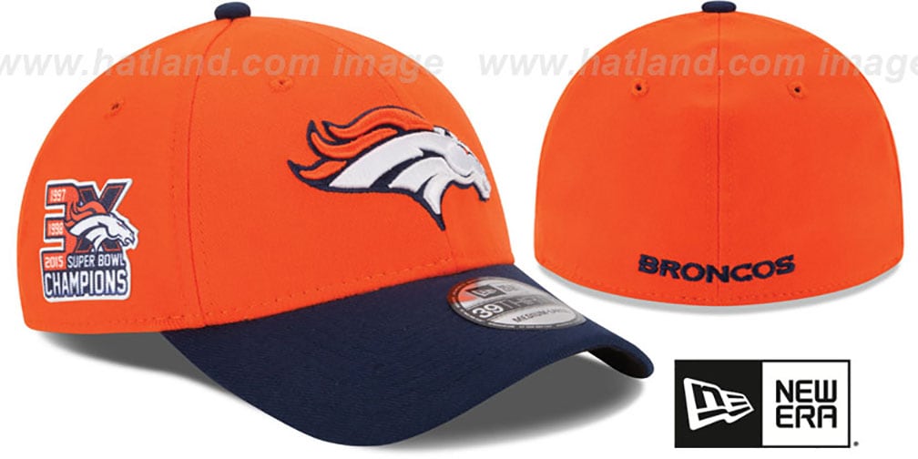 NOW $24.99VERY LIMITED QUANTITIES, Orders now shipping!!, New Era 39THIRTY stretch fit flex hat by New Era, orange authentic poly crown with dark navy blue pre-curved visor, raised embroidered team logo on front, embroidered New Era logo on side, embroidered 3X SUPER BOWL CHAMPIONS patch on opposite side, embroidered BRONCOS team font on back, This Flex 39THIRTY hat fits approximate head sizes, SM/MED 6 7/8 - 7 3/8, MED/LG 7 1/4 - 7 5/8, LG/XL 7 1/2 - 8