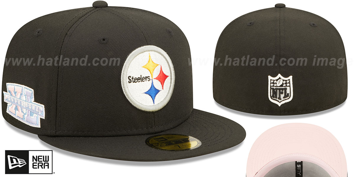 NOW $43.19Authentic and Original 59Fifty fitted hat by New Era, black authentic poly crown and visor, light pink undervisor and sweatband, raised embroidered team logo on front, SUPER BOWL XL embroidered side-patch in sky blue-lavender-pink-white, embroidered New Era logo on opposite side, matching raised embroidered NFL shield logo on back