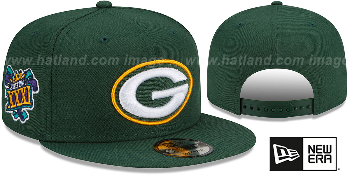 NOW $33.99This New Era 9FIFTY adjustable hat features a deep crown and flat brim design similar to the 59-FIFTY style. It has a dark green authentic poly crown and visor, a light grey undervisor, and a black sweatband. The front showcases a raised embroidered team logo, while the side displays an embroidered Super Bowl XXXI logo patch. The opposite side bears the embroidered New Era logo. The hat is finished with an adjustable team-color Snapback strap closure