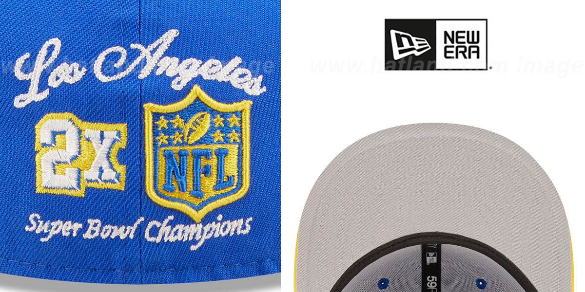 NOW $47.59This authentic, officially licensed 59Fifty fitted cap by New Era features a bright royal blue crown and yellow visor, with a light grey undervisor. The front showcases a stitched and embroidered Letterman team logo, while the side includes a SUPER BOWL LVI embroidered patch and matching stitched/embroidered 'Letterman LA' text. The back displays a 2X Super Bowl Champions logo and a raised embroidered NFL Shield