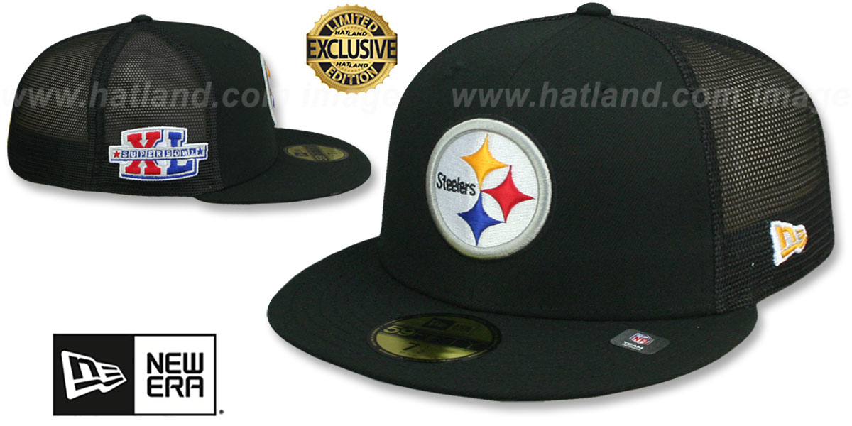 NOW $44.99Authentic and Original 59Fifty fitted hat by New Era, black authentic poly front panels and visor with black trucker mesh middle and back panels, light grey undervisor, black sweatband, raised embroidered team logo on front, matching embroidered SUPER BOWL XL logo side-patch on side in official colors, matching embroidered New Era logo on opposite side, matching raised embroidered NFL shield logo in team colors on back